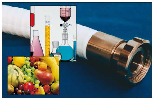 Für die Verbindung von Lebensmittel verarbeitenden Maschinen zu den Abfüllstationen für z.B. Joghurt, Hüttenkäse, Suppen, flüssige Schokoladen, Konfitüren usw., werden flexible Verbindungsleitungen, respektive flexible Förderschläuche mit Inox-Armaturen eingesetzt.